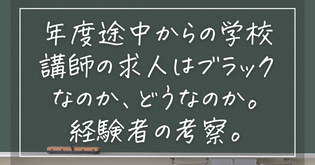 私は年度途中の講師求人に飛びついたことが2度あります。たいていの人は4月から勤務開始の求人に応募して勤務をすると思いますが、諸事情あって年度途中からという方もいるかと思いますので、そういう方のお役に立てたらと思い、今回は記事を書くことにしました。
